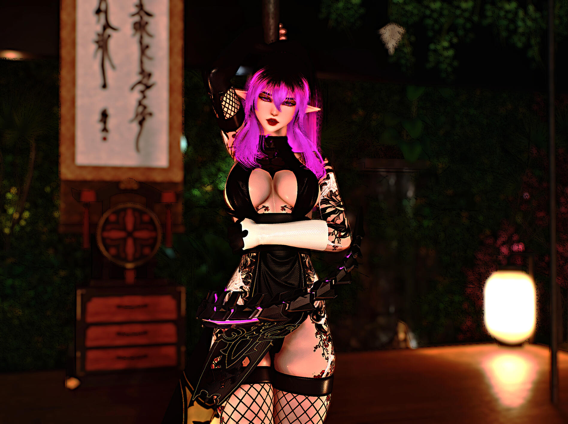 Bio: A Kugane-born kunoichi from humble beginnings who turned to clandestine work, mastering seduction to infiltrate high society. She carries a family succubus curse that heightens her allure and allows her to shift between three forms: a radiant aura, an adorable Miqo'te, or a towering Viera. Mischievous or sweet depending on desire, she weaponizes pleasure as both survival and art.